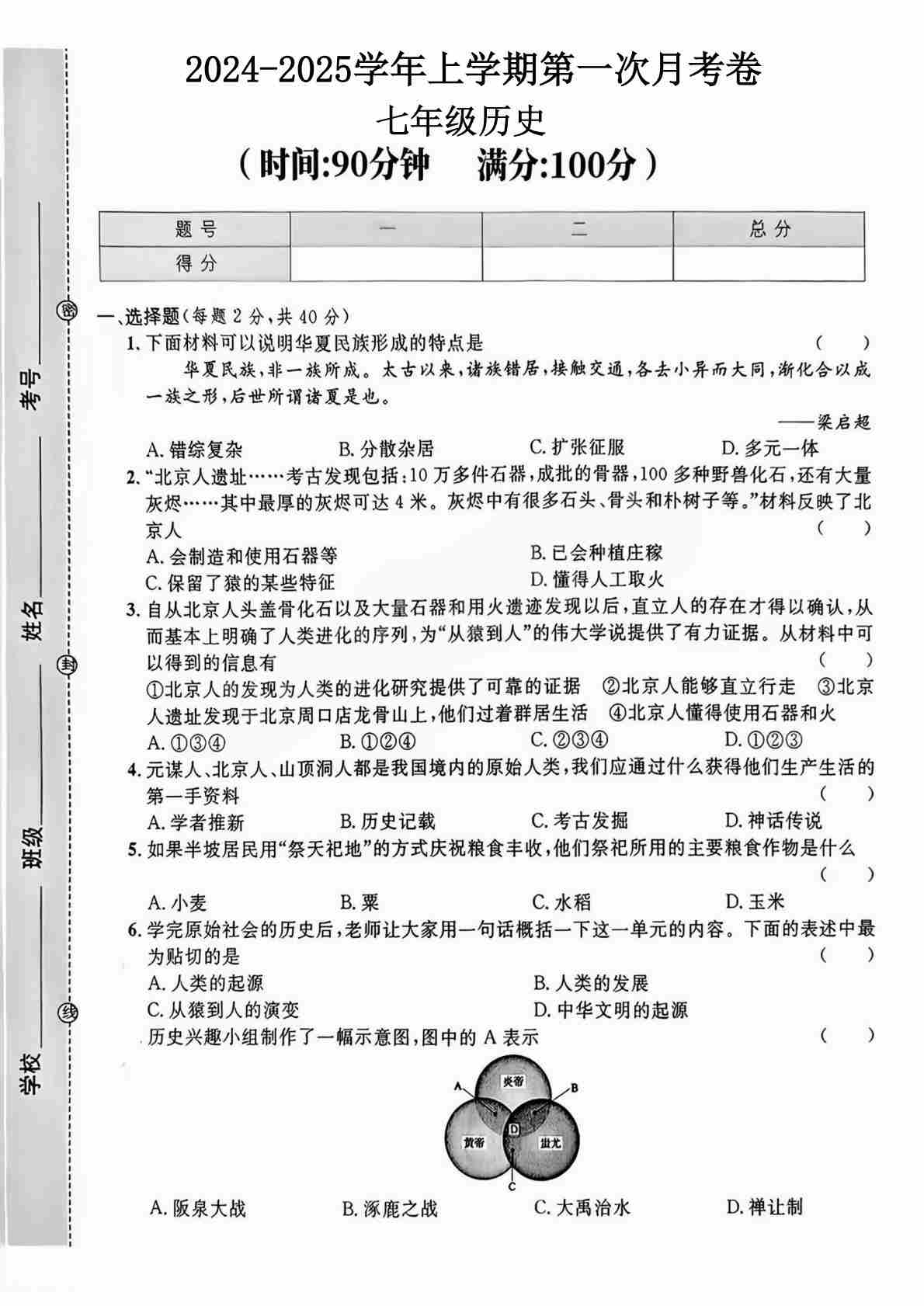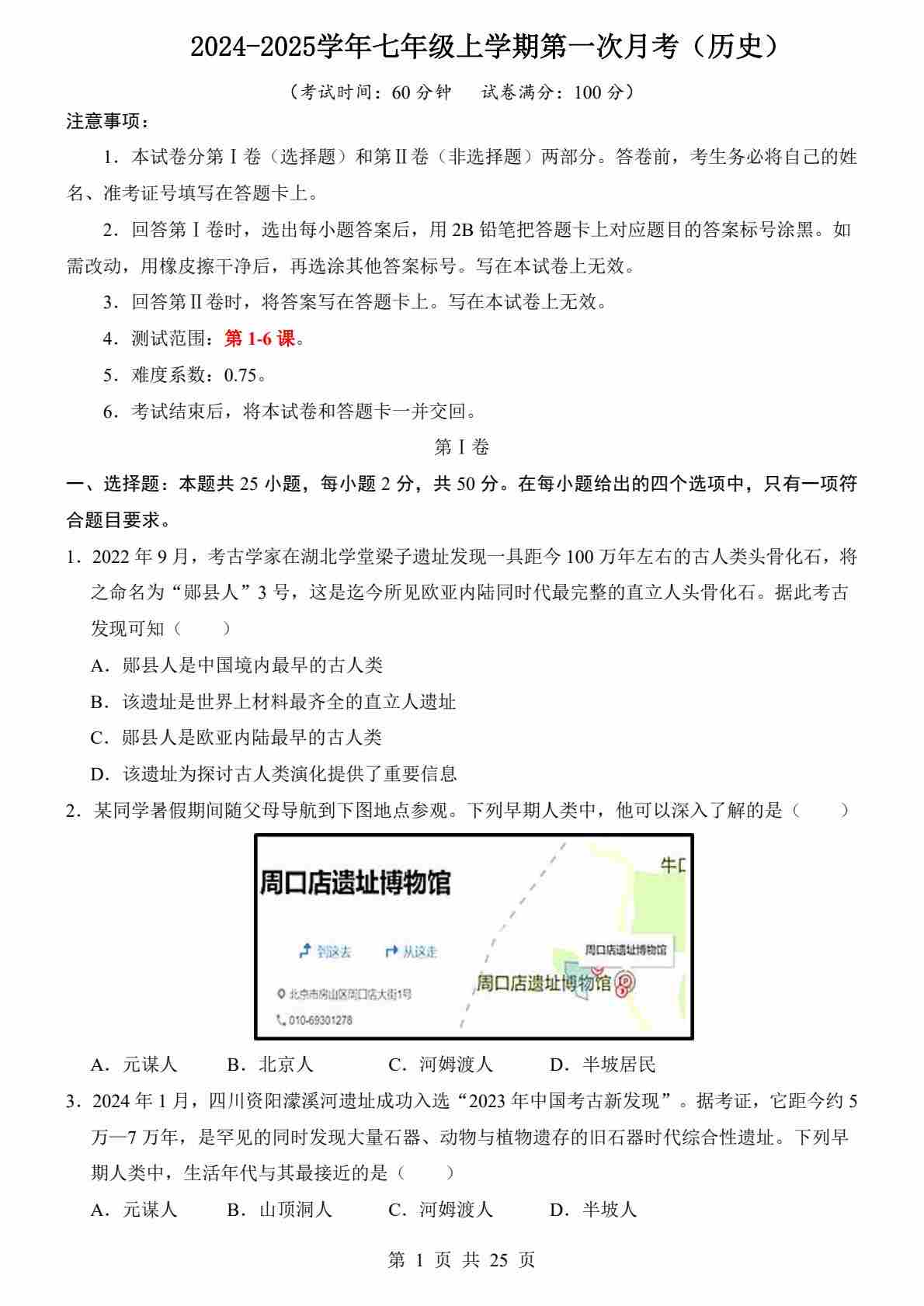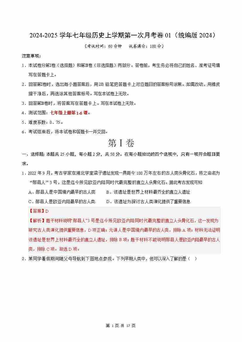 7上历史2024-2025学年第一次月考卷