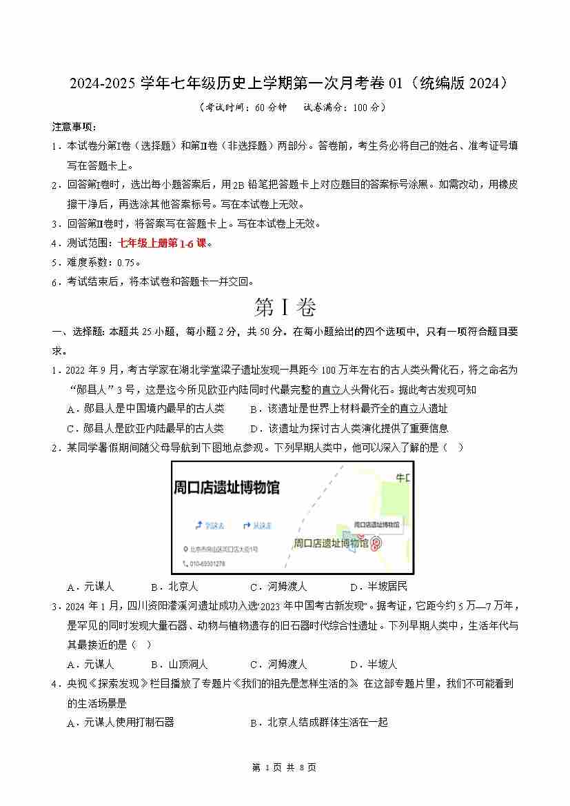 七年级历史第一次月考卷01(考试版A4)【测试范围:第1-6课】(统编版2024)