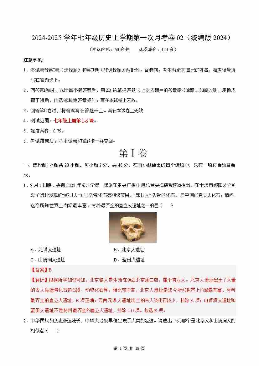 七年级历史第一次月考卷02(考试版A4)【测试范围:第1-6课】(统编版2024)