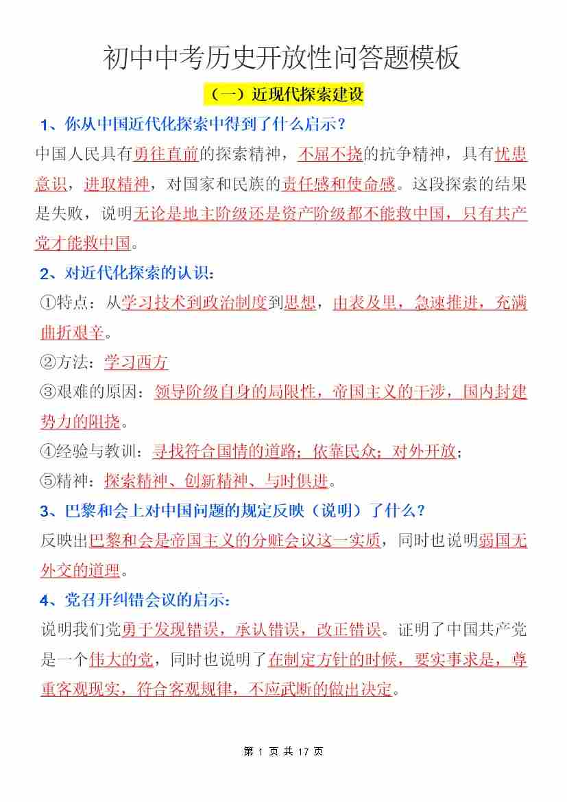 中考历史-开放性问答题模板
