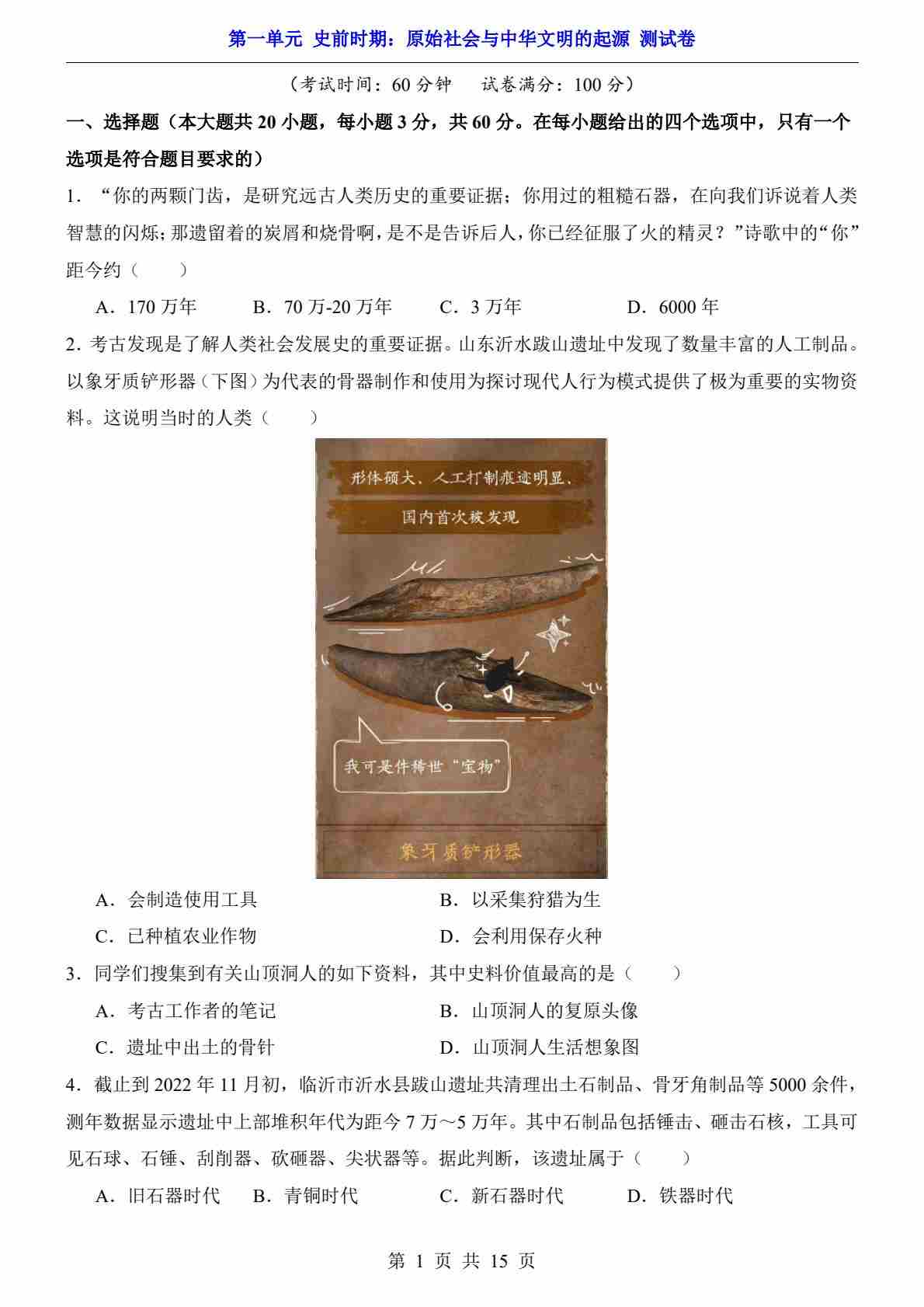 第1单元 史前时期(测试卷)