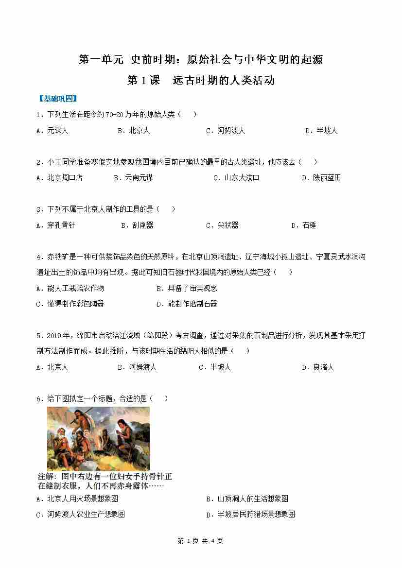第1课 远古时期的人类活动(分层作业)(原卷版)
