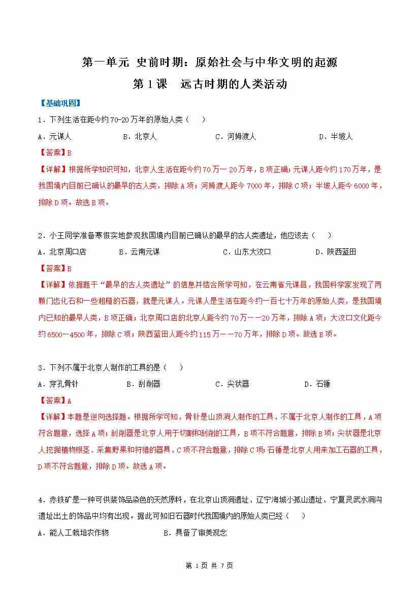 第1课 远古时期的人类活动(分层作业)(解析版)