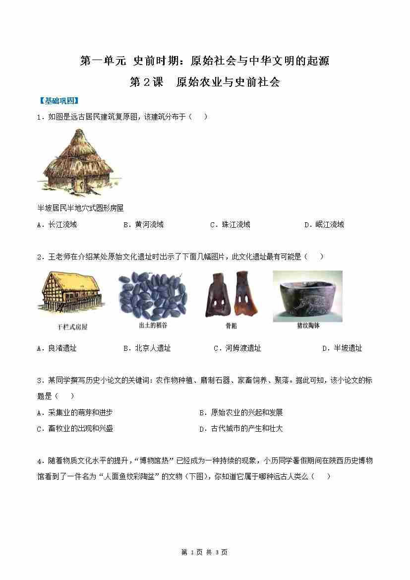 第2课 原始农业与史前社会(分层作业)(原卷版)