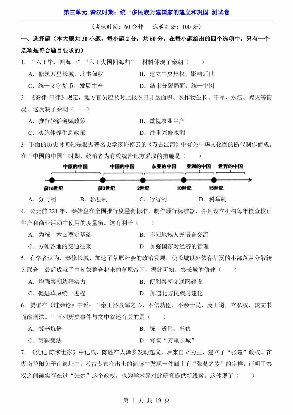 第3单元 秦汉时期(测试卷)
