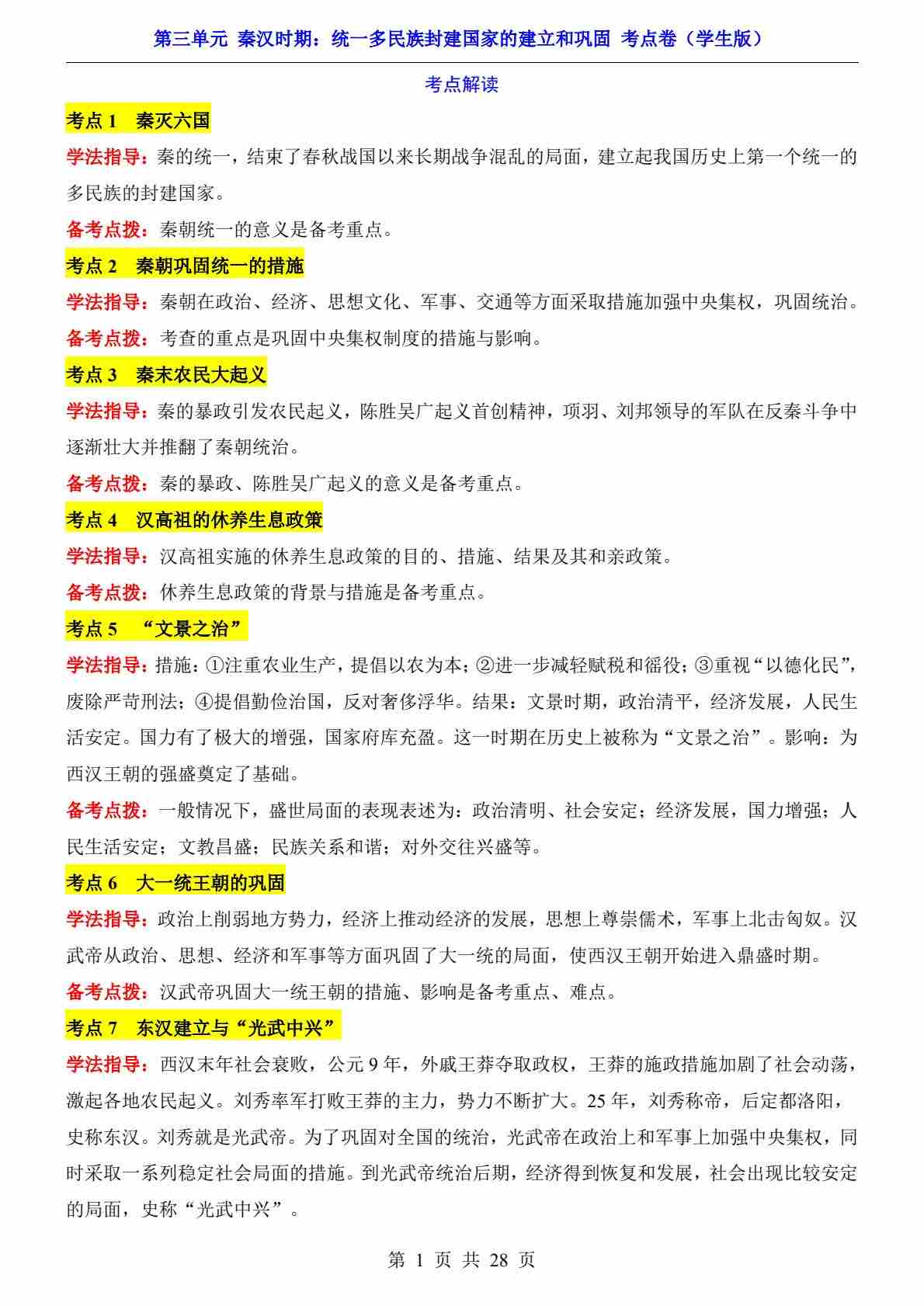 第3单元 秦汉时期(考点卷)