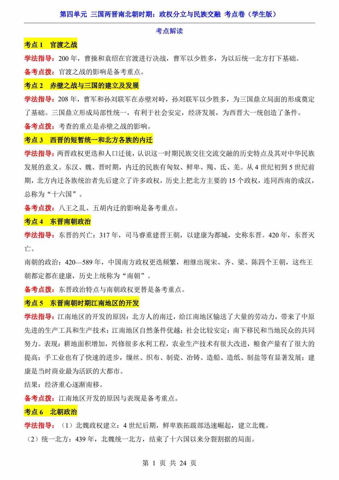 第4单元 三国两晋南北朝时期(考点卷)