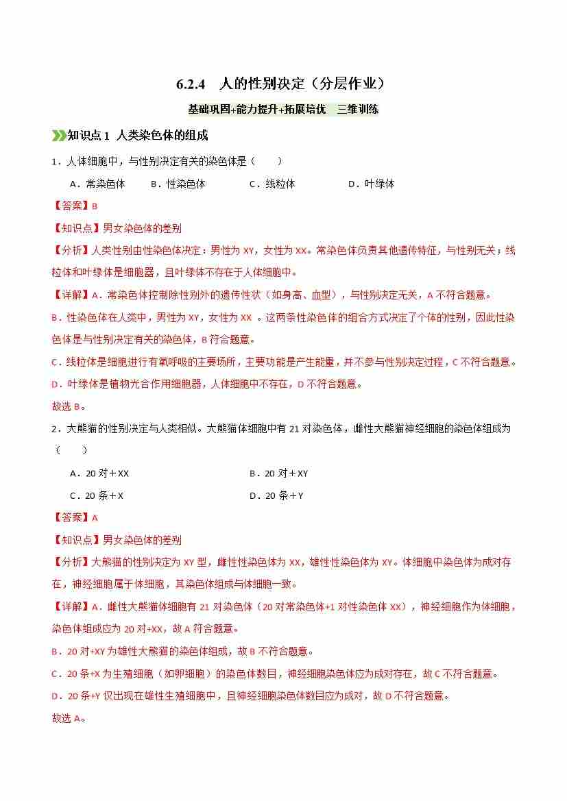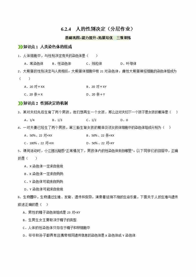 6.2.4 人的性别决定(分层作业)(原卷版)