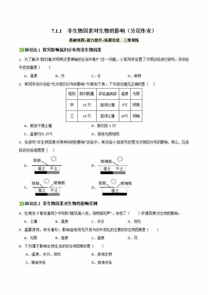 7.1.1 非生物因素对生物的影响(分层作业)(原卷版)