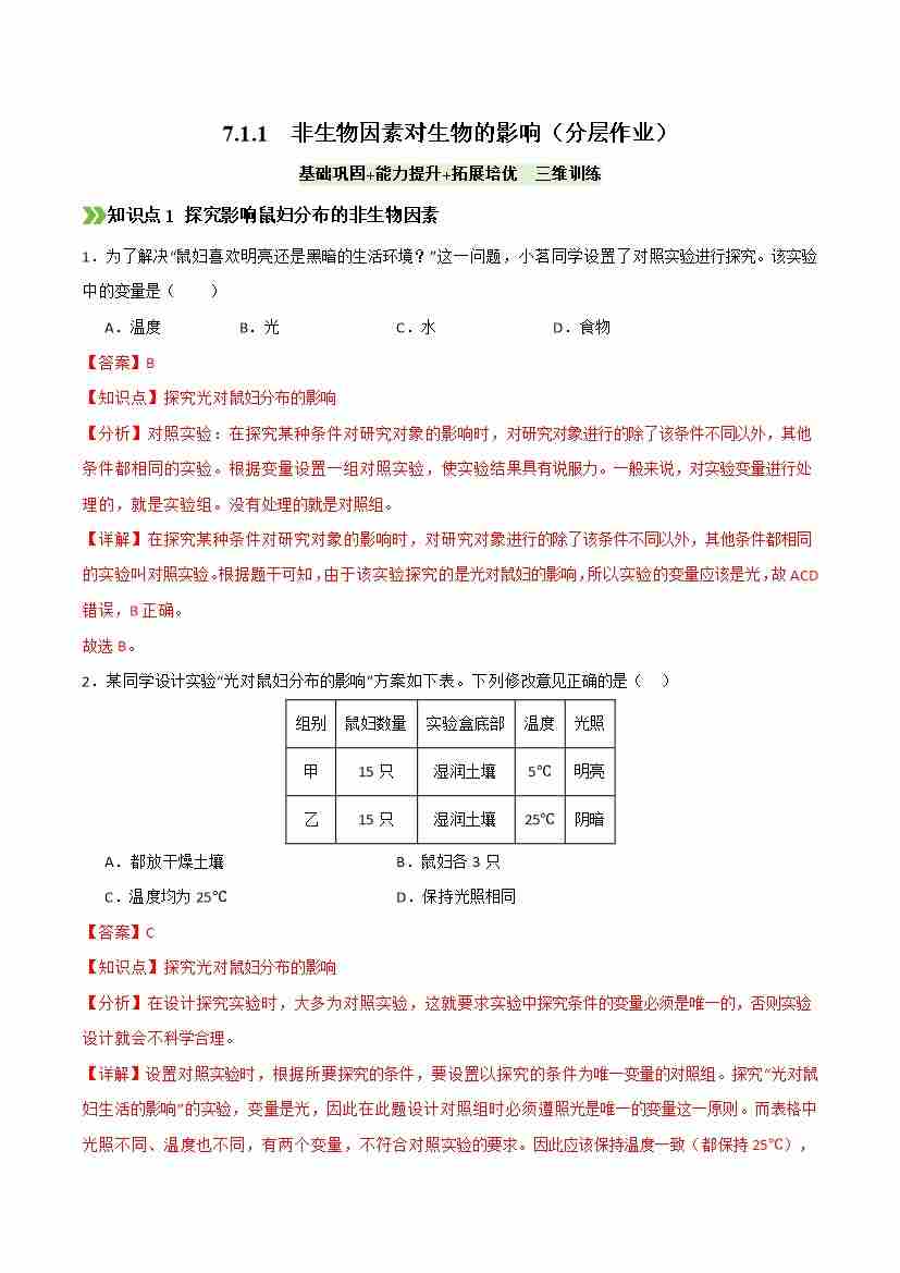 7.1.1 非生物因素对生物的影响(分层作业)(解析版)