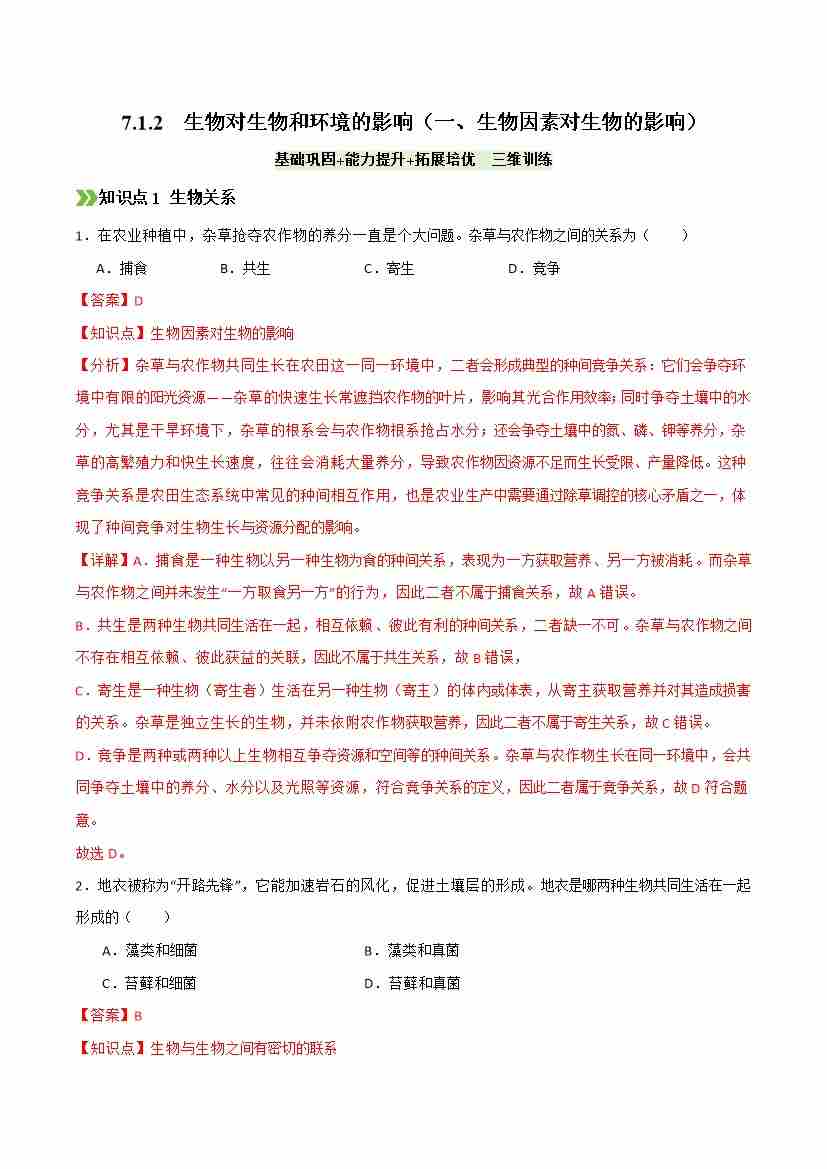 7.1.2 生物对生物和环境的影响(一、生物因素对生物的影响)(分层作业)(解析版)