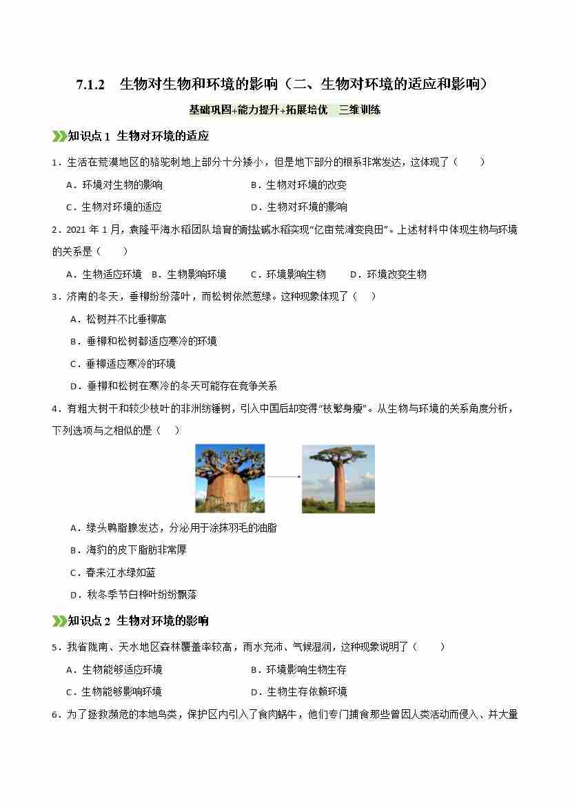 7.1.2 生物对生物和环境的影响(二、生物对环境的适应和影响)(分层作业)(原卷版)
