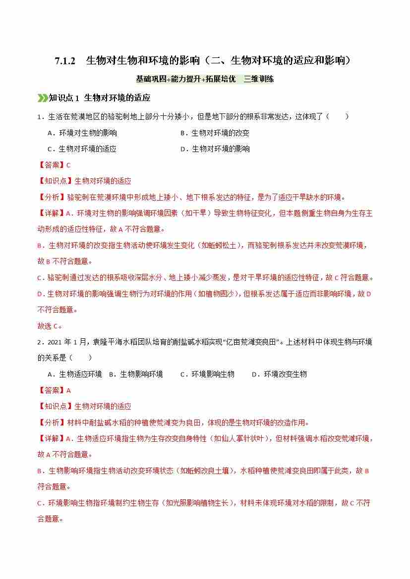 7.1.2 生物对生物和环境的影响(二、生物对环境的适应和影响)(分层作业)(解析版)