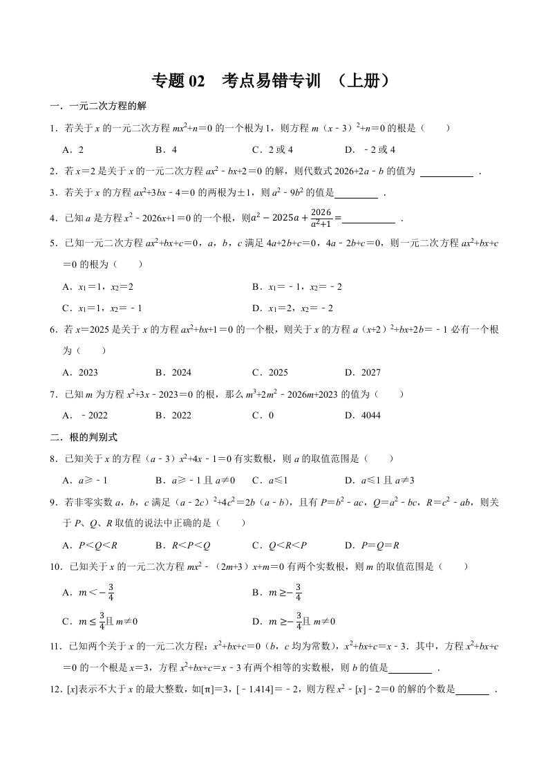 专题02 考点易错专训(上册考点)(高效培优期末专项训练)(原卷版)