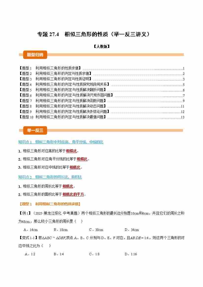 专题27.4 相似三角形的性质(举一反三讲义)(解析版)
