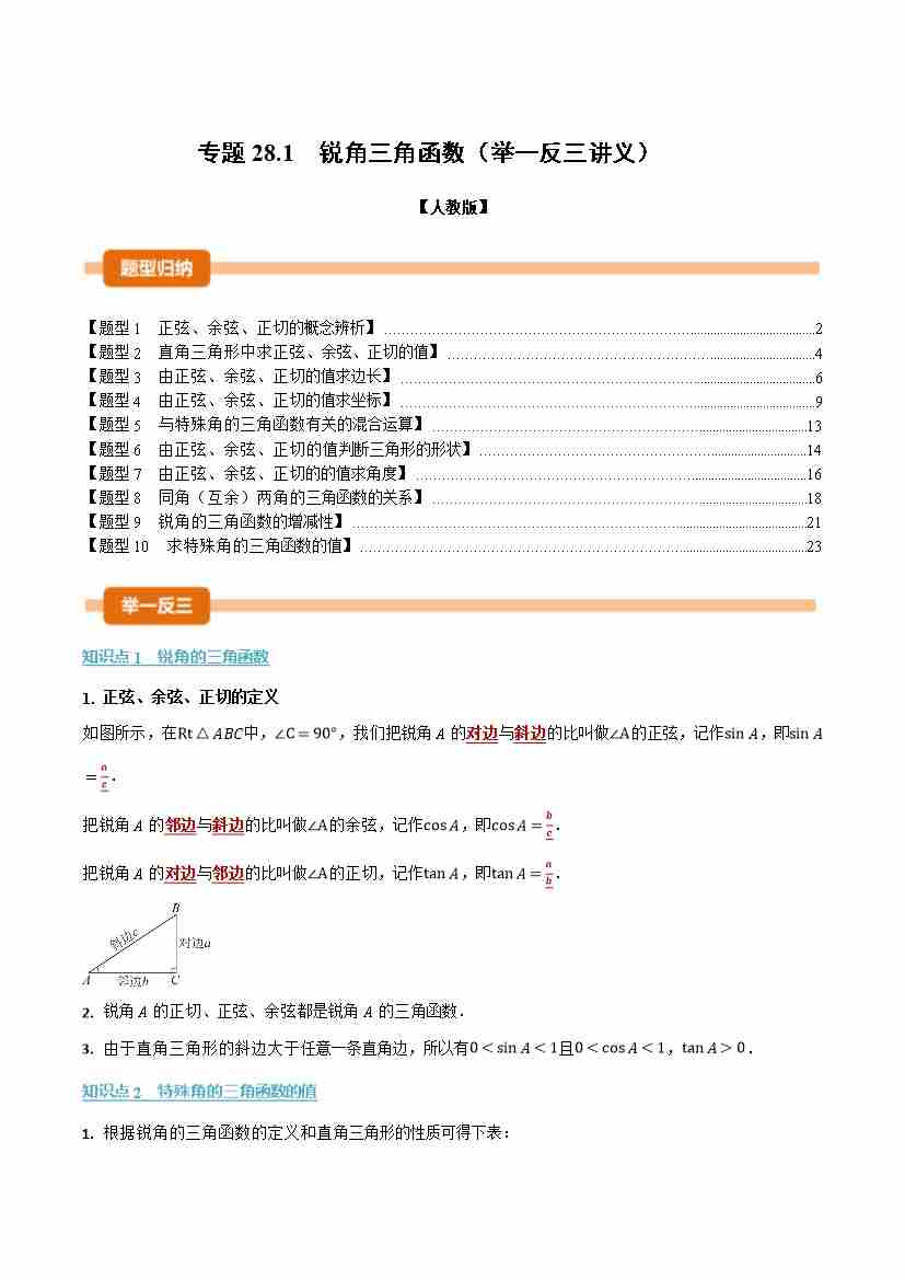 专题28.1 锐角三角函数(举一反三讲义)(解析版)