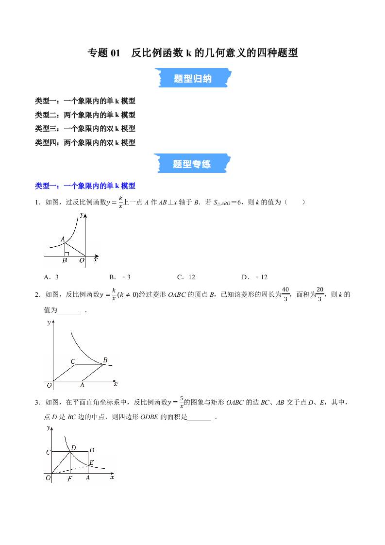 专题01 反比例函数k的几何意义的四种题型(高效培优专项训练)(原卷版)