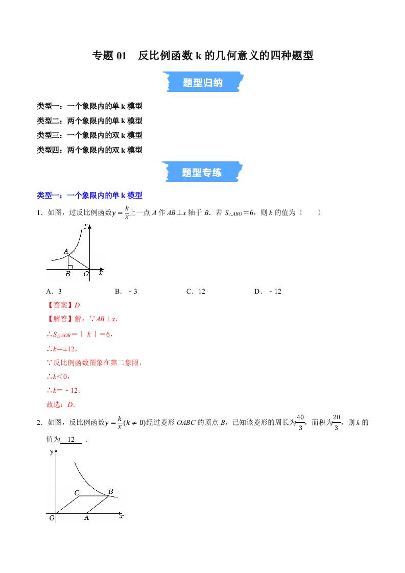 专题01 反比例函数k的几何意义的四种题型(高效培优专项训练)(解析版)