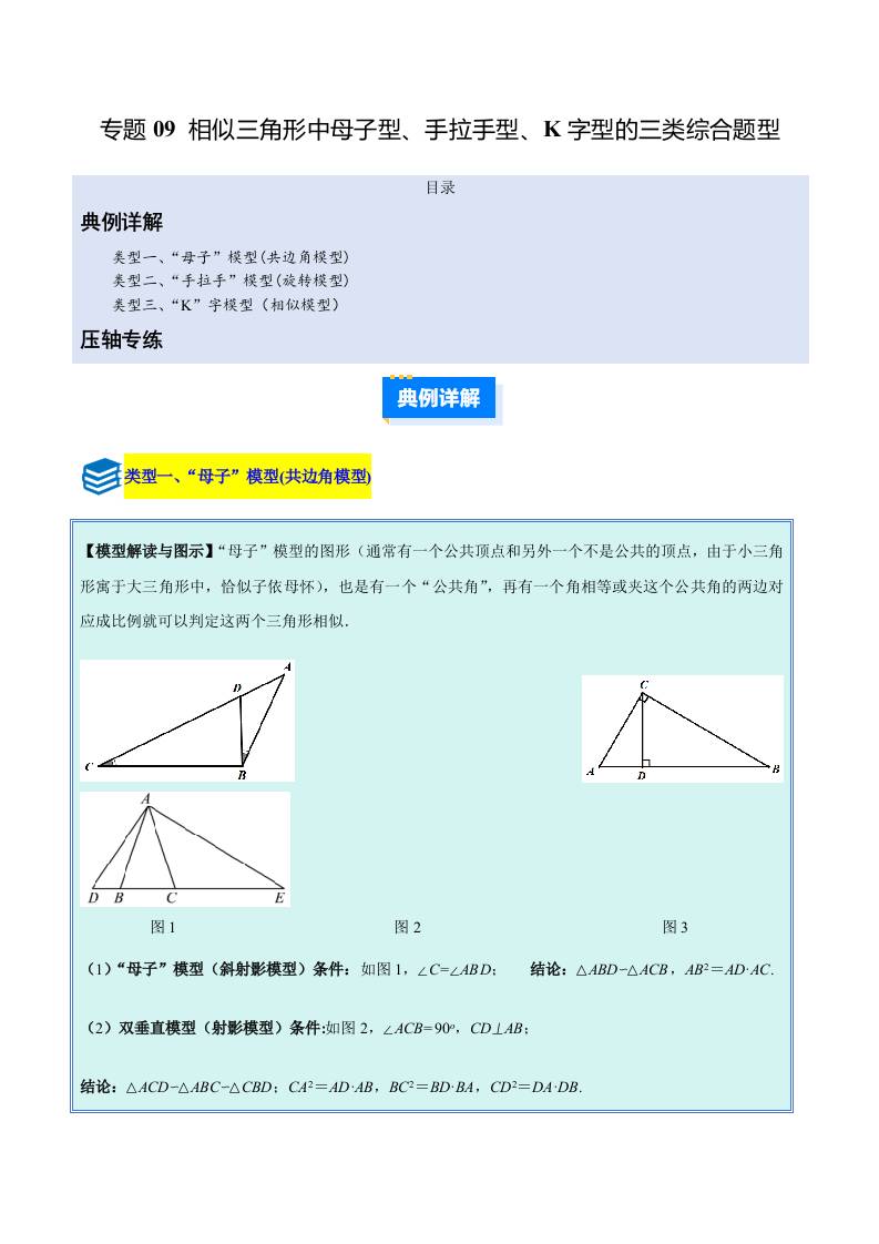 专题09 相似三角形中母子型、手拉手型、K字型的三类综合题型(压轴题专项训练)(原卷版)