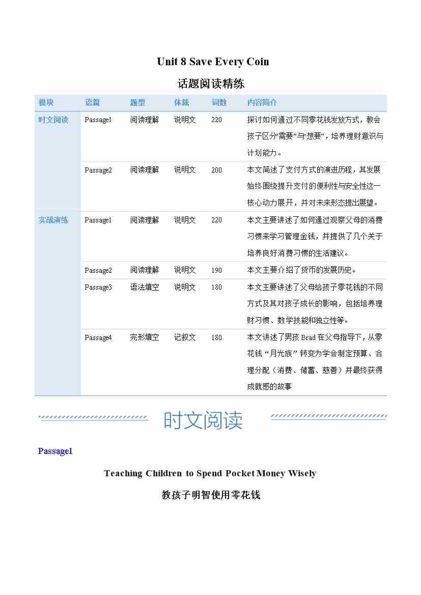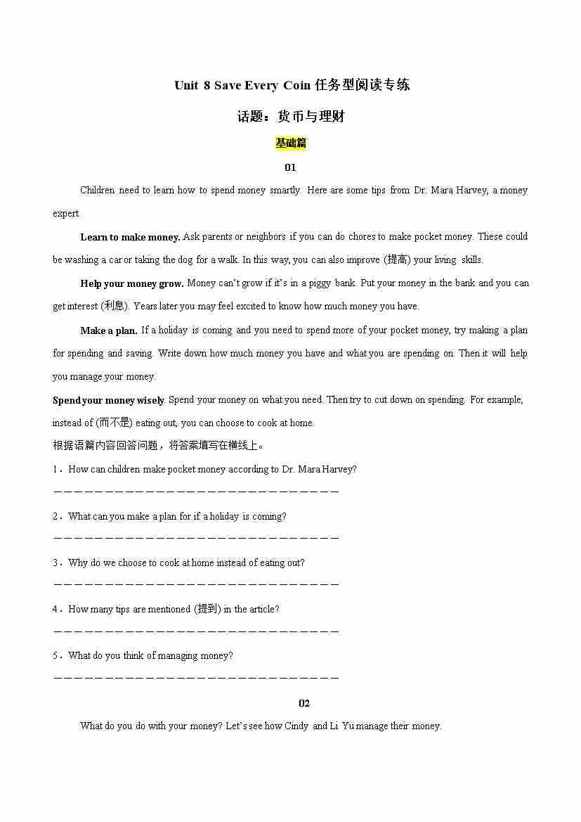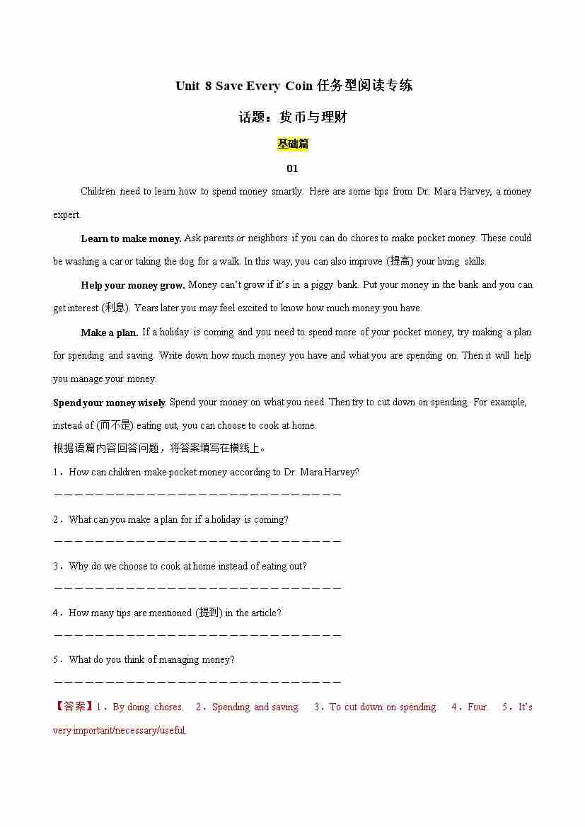 Unit 8 Every Coin Counts!(话题阅读精练)(原卷版)