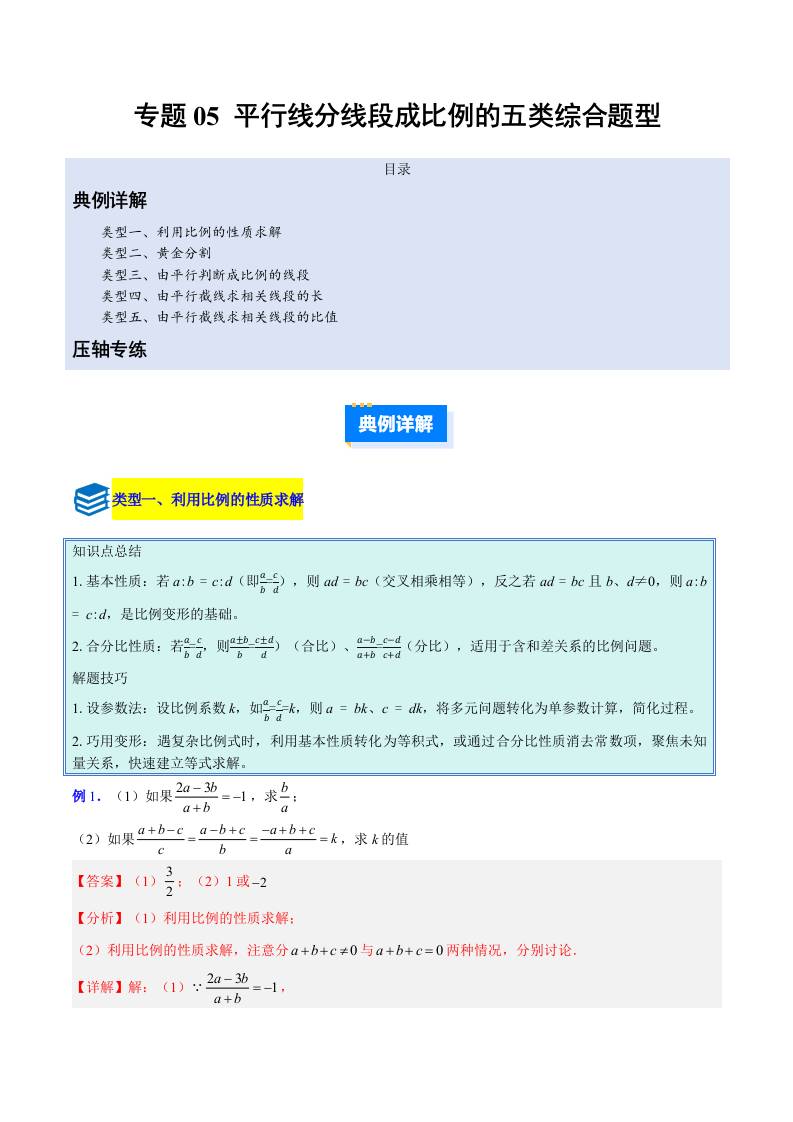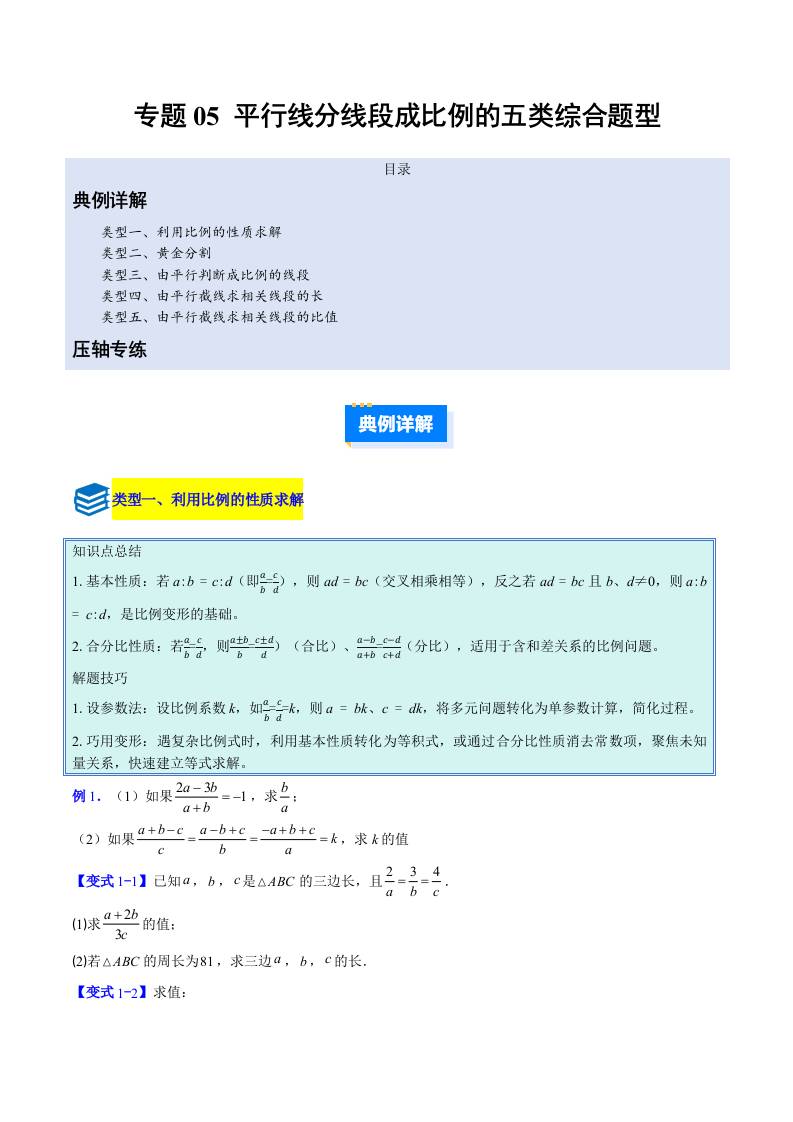 专题05 平行线分线段成比例的五类综合题型(压轴题专项训练)(原卷版)