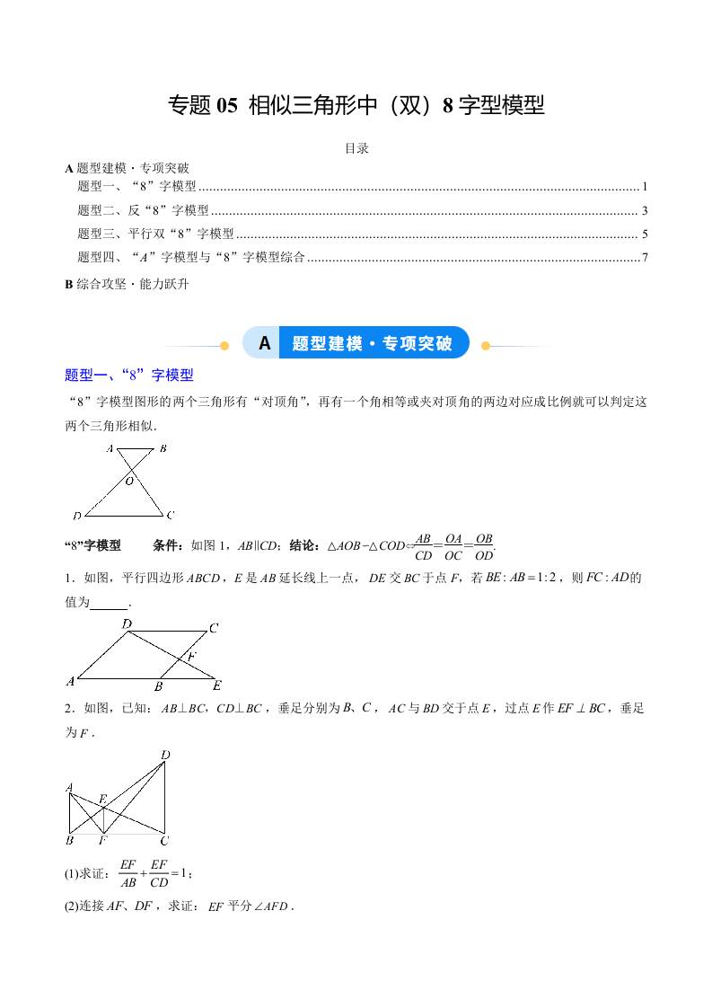 专题05 相似三角形中(双)8字型模型(4大题型)(专项训练)(学生版)