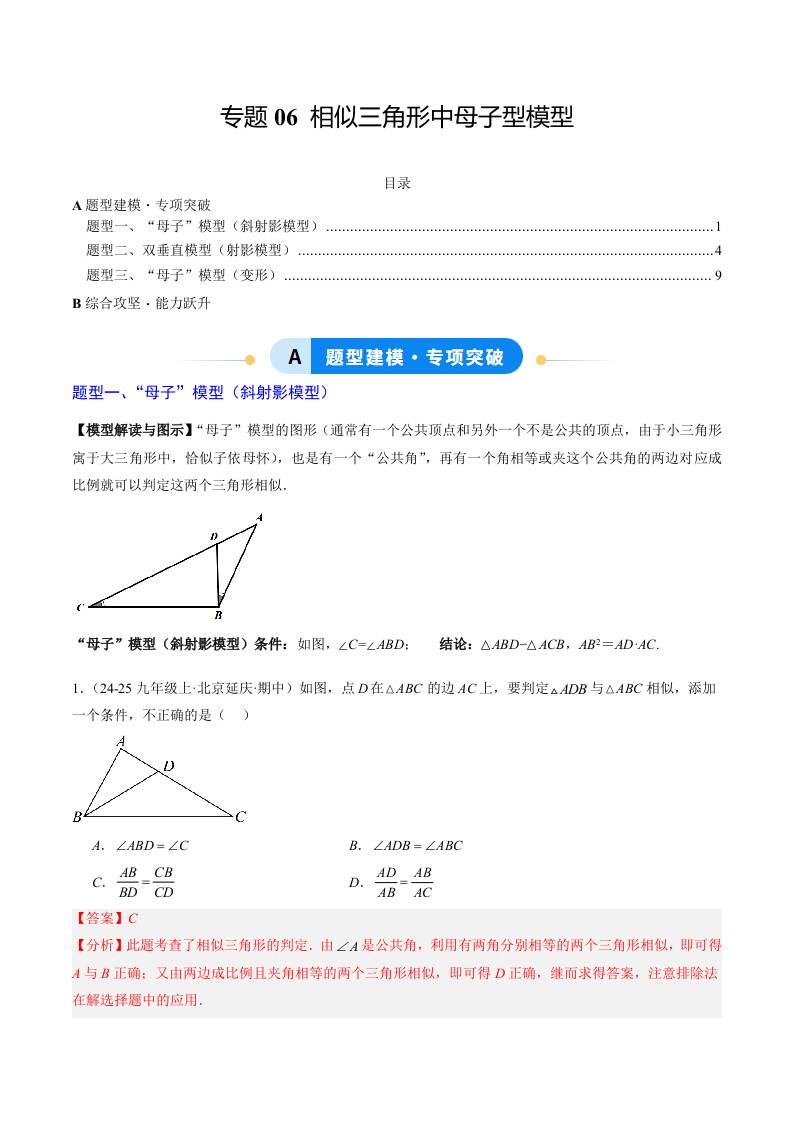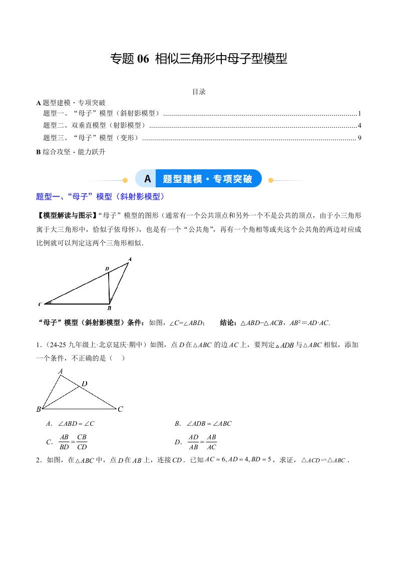专题06 相似三角形中母子型模型(3大题型)(专项训练)(学生版)