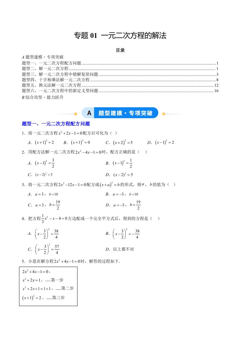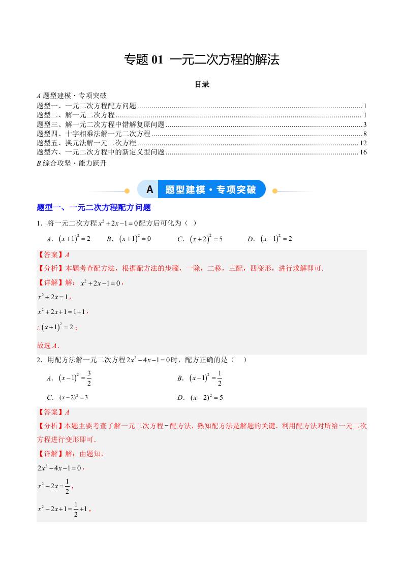 专题01 一元二次方程的解法(专项训练)(学生版)