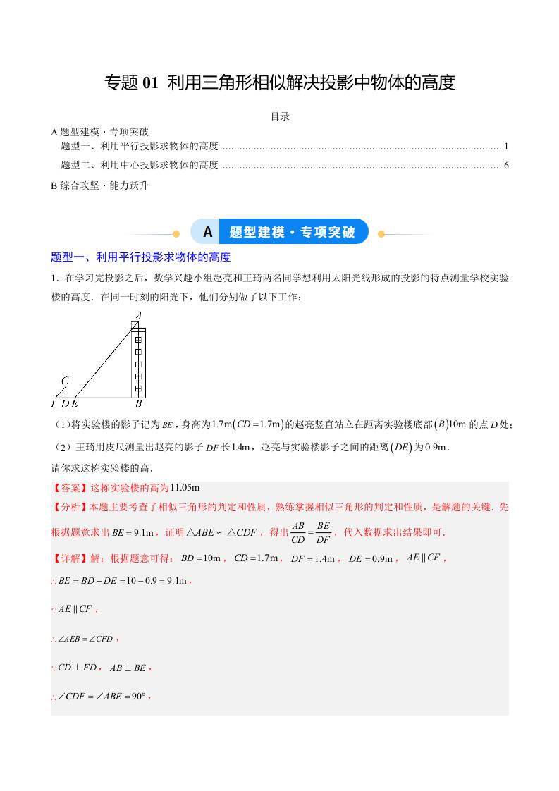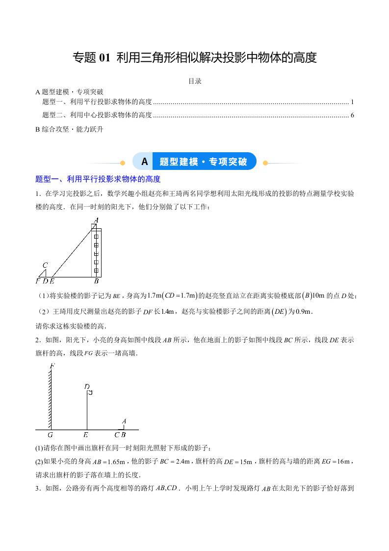 专题01 利用三角形相似解决投影中物体的高度(2大题型)(专项训练)(学生版)