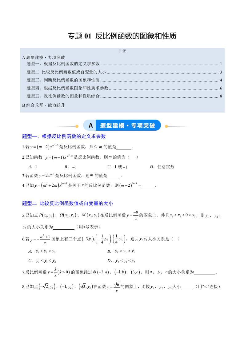 专题01 反比例函数的图象和性质(5大题型)(专项训练)(学生版)