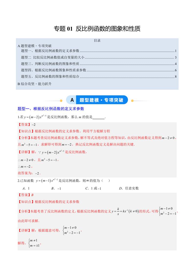 专题01 反比例函数的图象和性质(5大题型)(专项训练)(教师版)