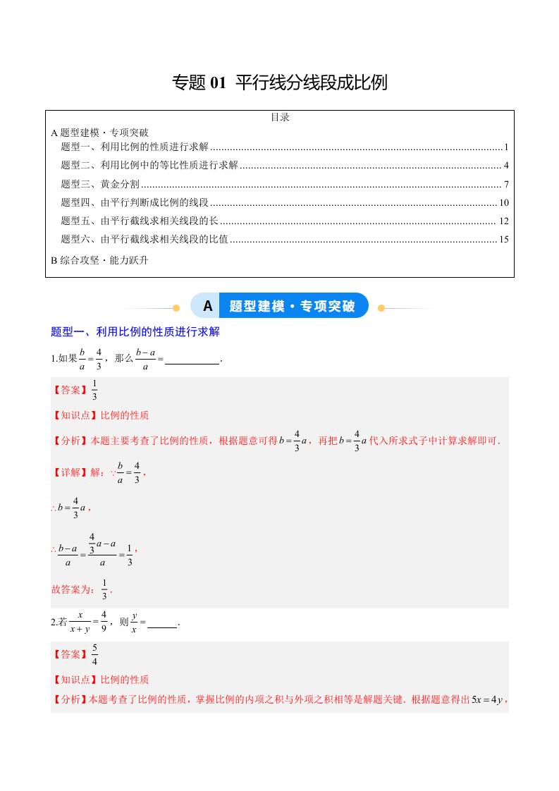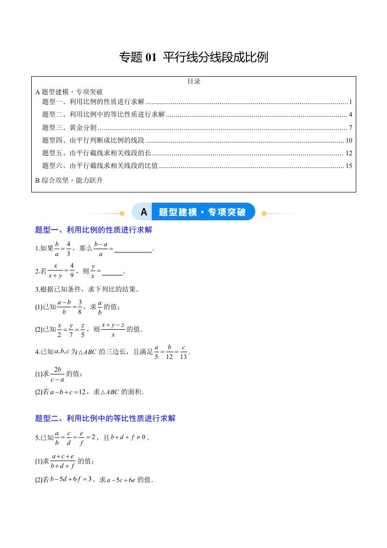 专题01 平行线分线段成比例(6大题型)(专项训练)(学生版)