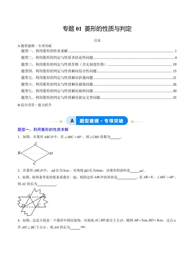 专题01 菱形的性质与判定(专项训练)(学生版)