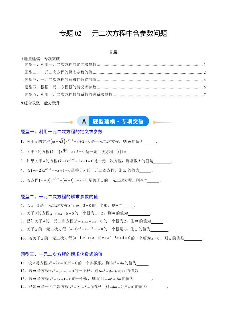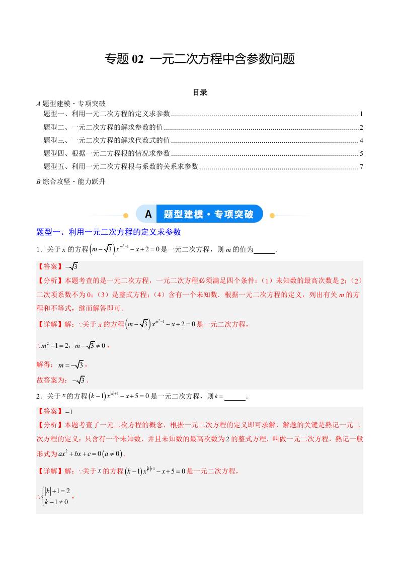 专题02 一元二次方程中含参数问题(专项训练)(学生版)