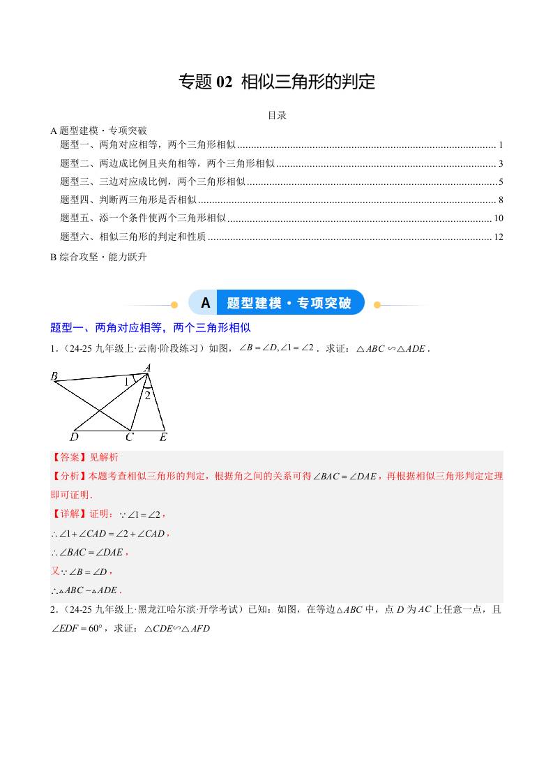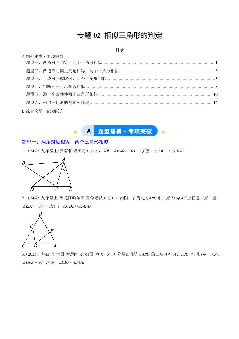 专题02 相似三角形的判定(6大题型)(专项训练)(学生版)