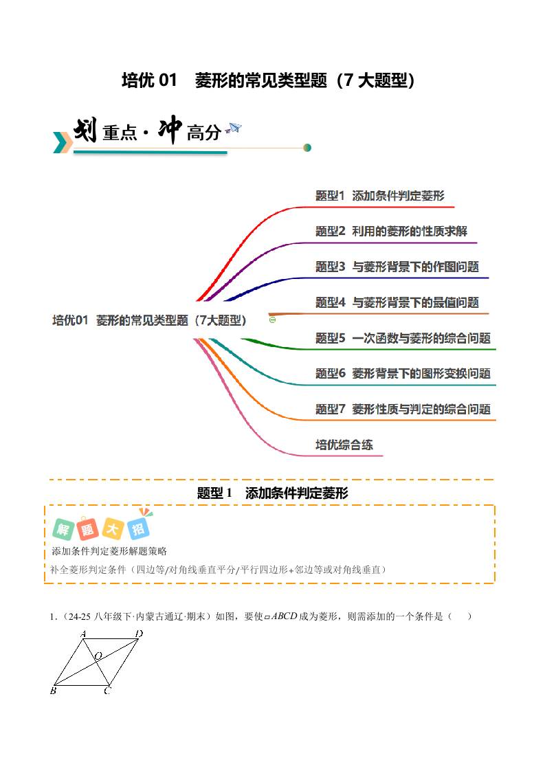 培优01 菱形的常见类型题(7大题型)(北师大2024)(原卷版)