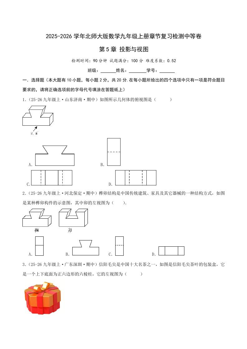 第5章 投影与视图(章节复习检测中等卷)原卷版