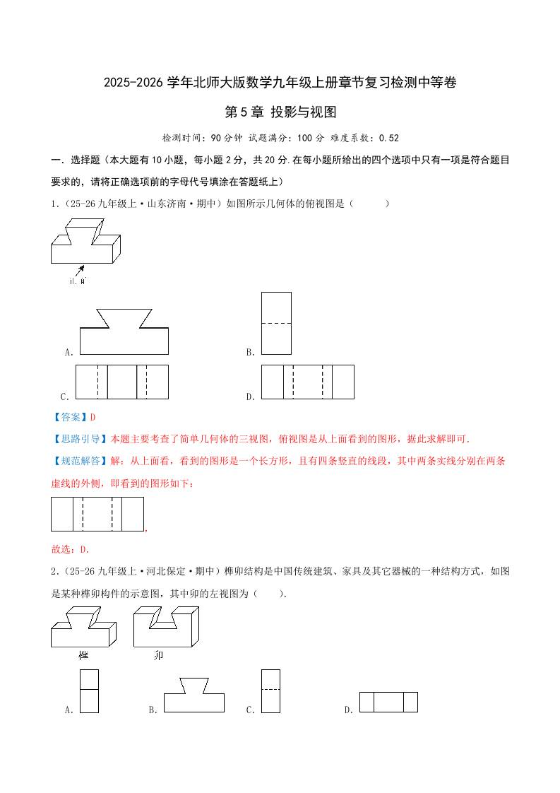 第5章 投影与视图(章节复习检测中等卷)解析版