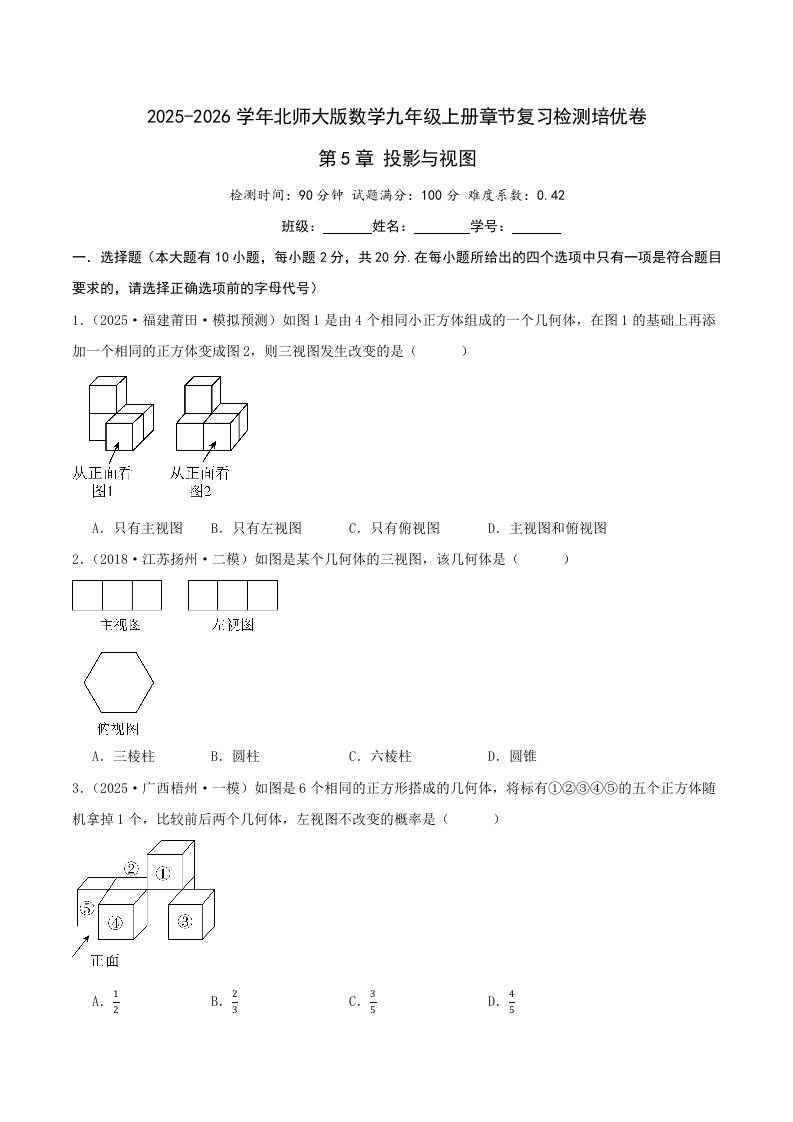 第5章 投影与视图(章节复习检测培优卷)原卷版
