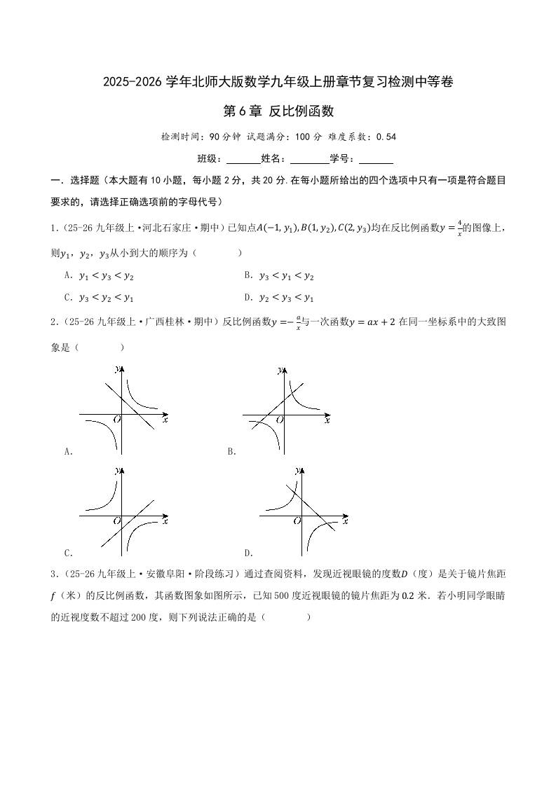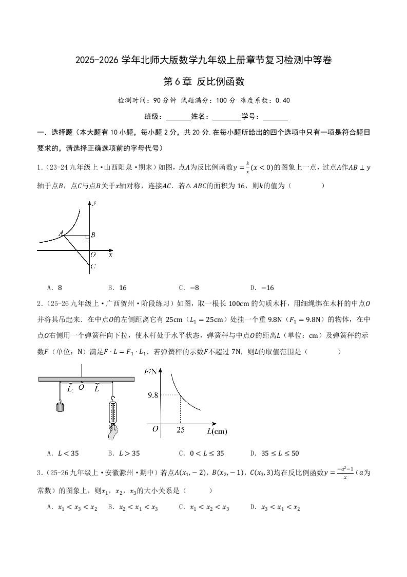 第6章 反比例函数(章节复习检测中等卷)原卷版