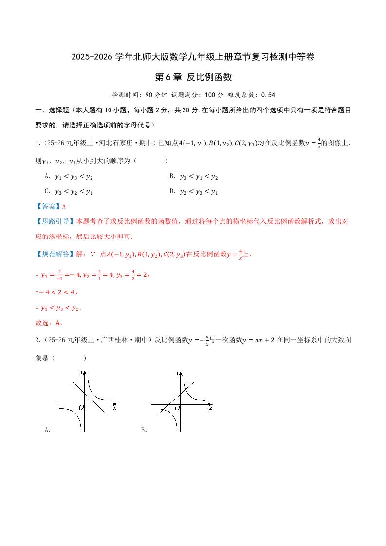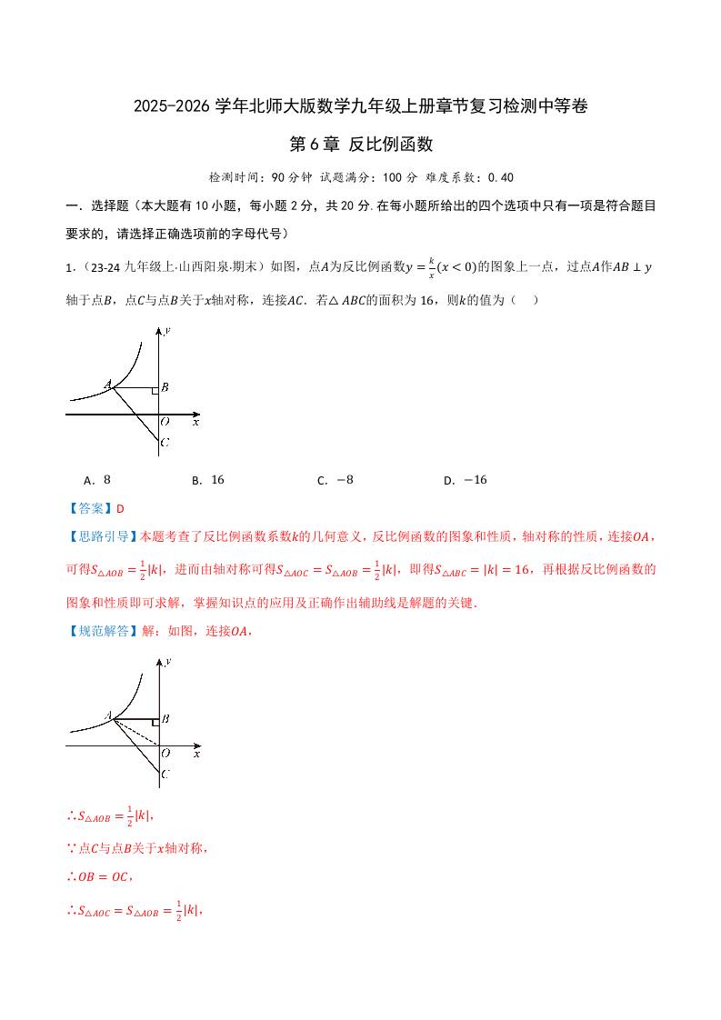 第6章 反比例函数(章节复习检测中等卷)解析版