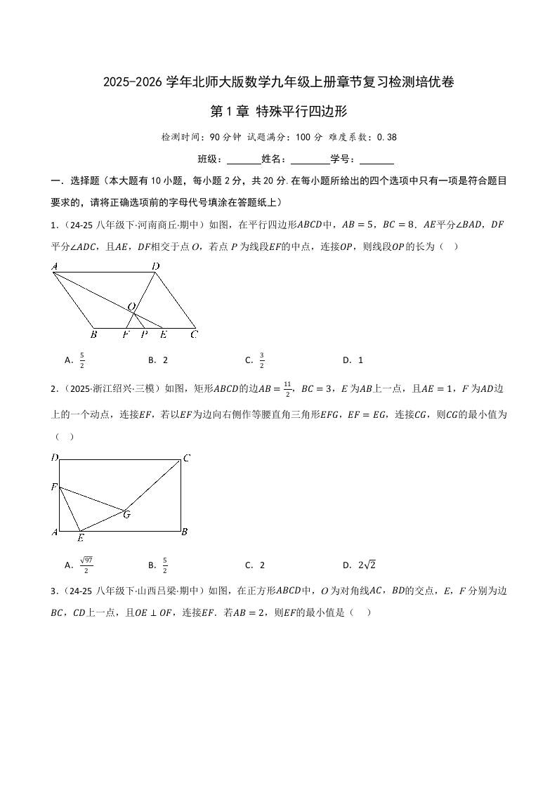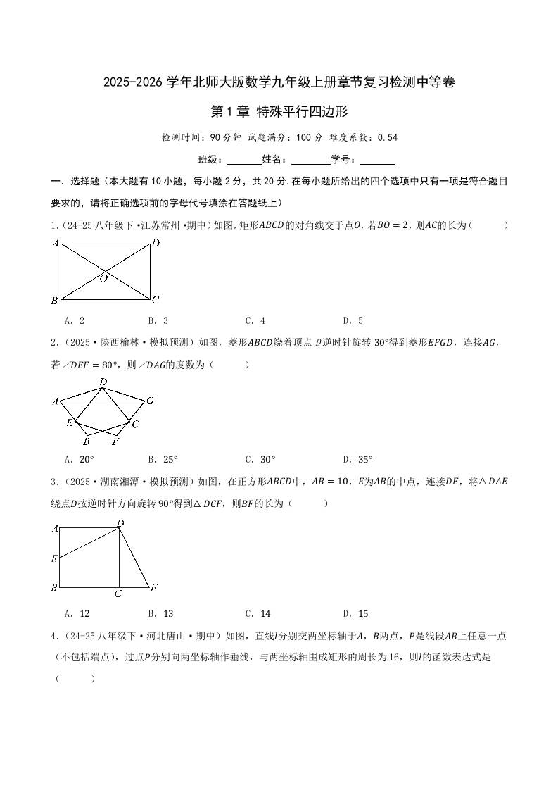 第1章 特殊平行四边形(章节复习检测中等卷)原卷版