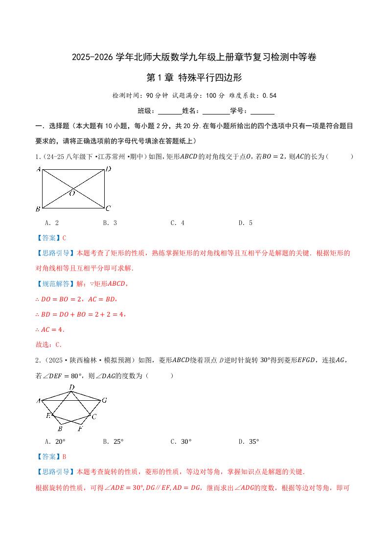 第1章 特殊平行四边形(章节复习检测中等卷)解析版