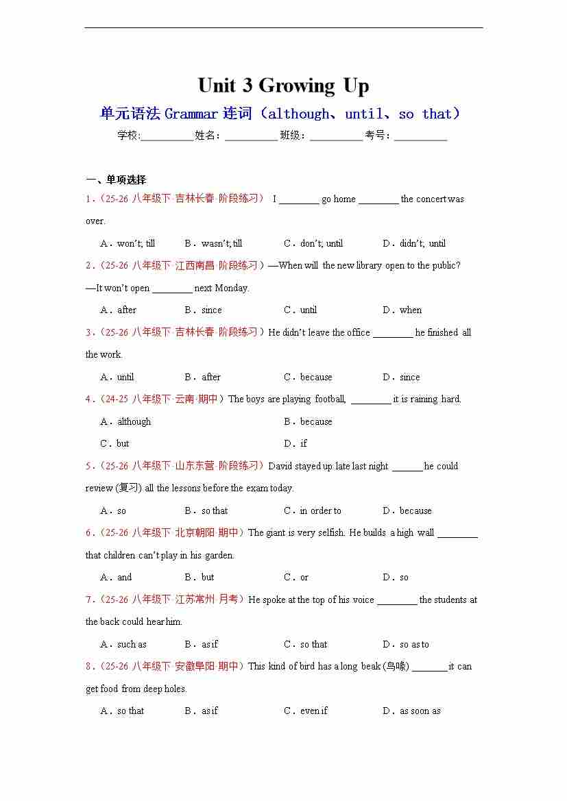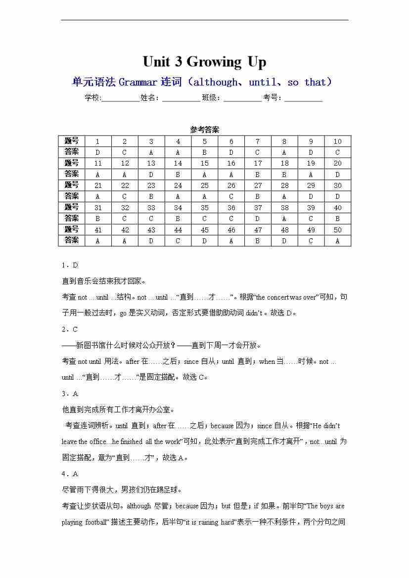 Unit 3 Growing Up单元语法Grammar连词(although、until、so that) 答案