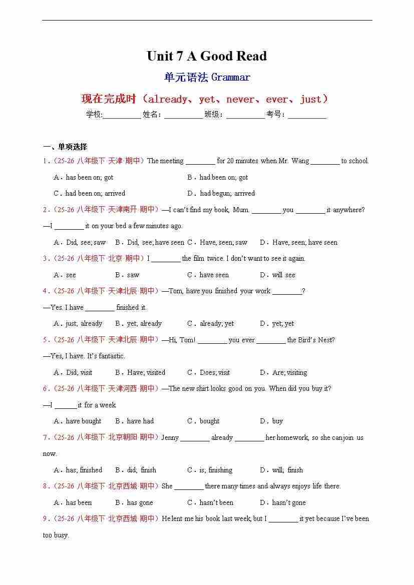 Unit 7 A Good Read单元语法Grammar现在完成时(already、yet、never、ever、just) 答案
