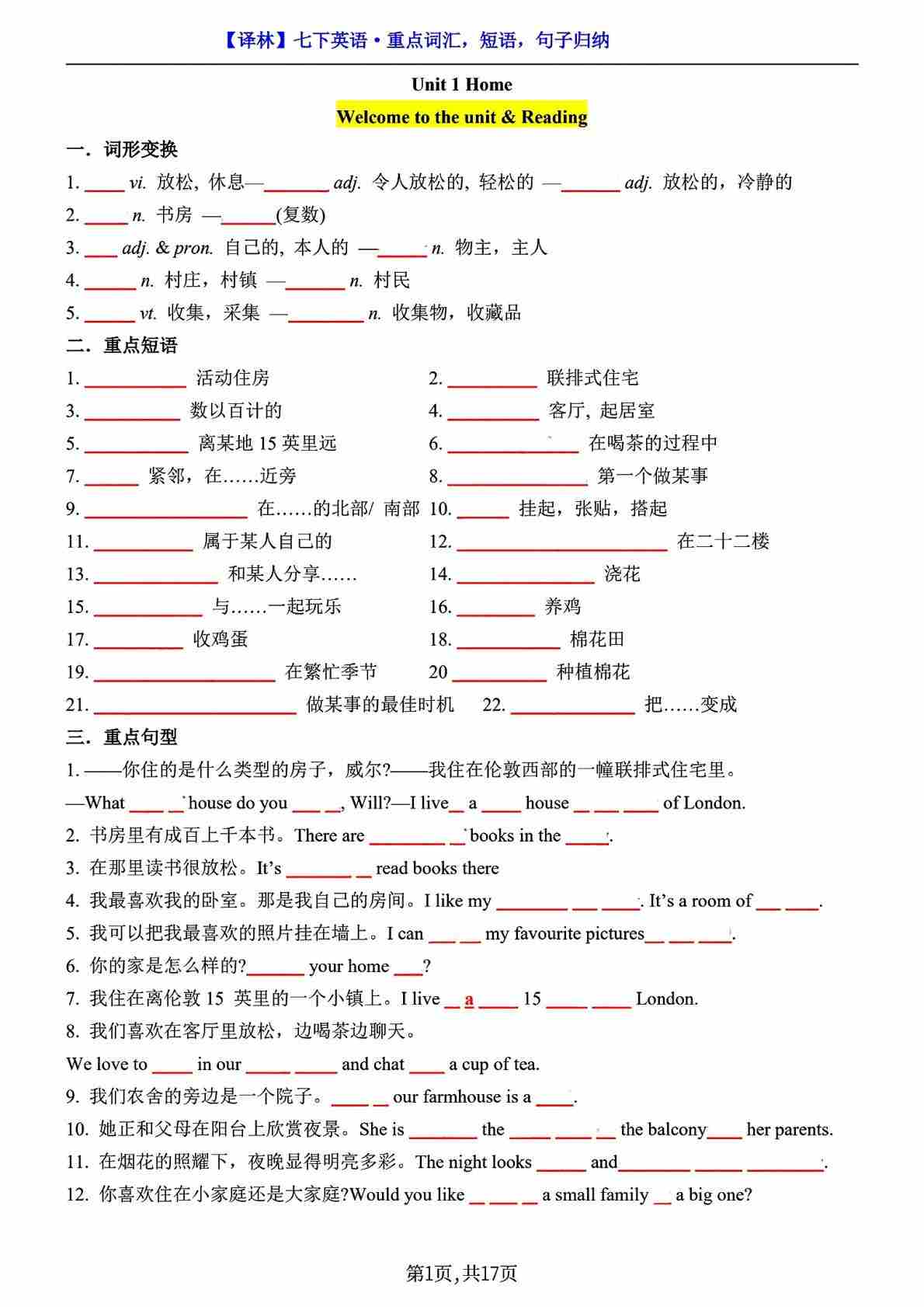 【_译林】七下英语全册重点词汇短语句子归纳(空白版)