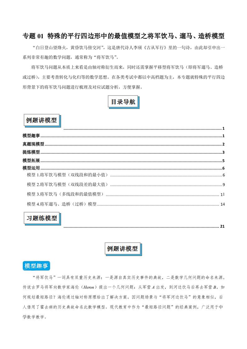专题01 特殊的平行四边形中的最值模型之将军饮马、遛马、造桥模型(几何模型讲义)数学北师大版九年级上册(学生版)