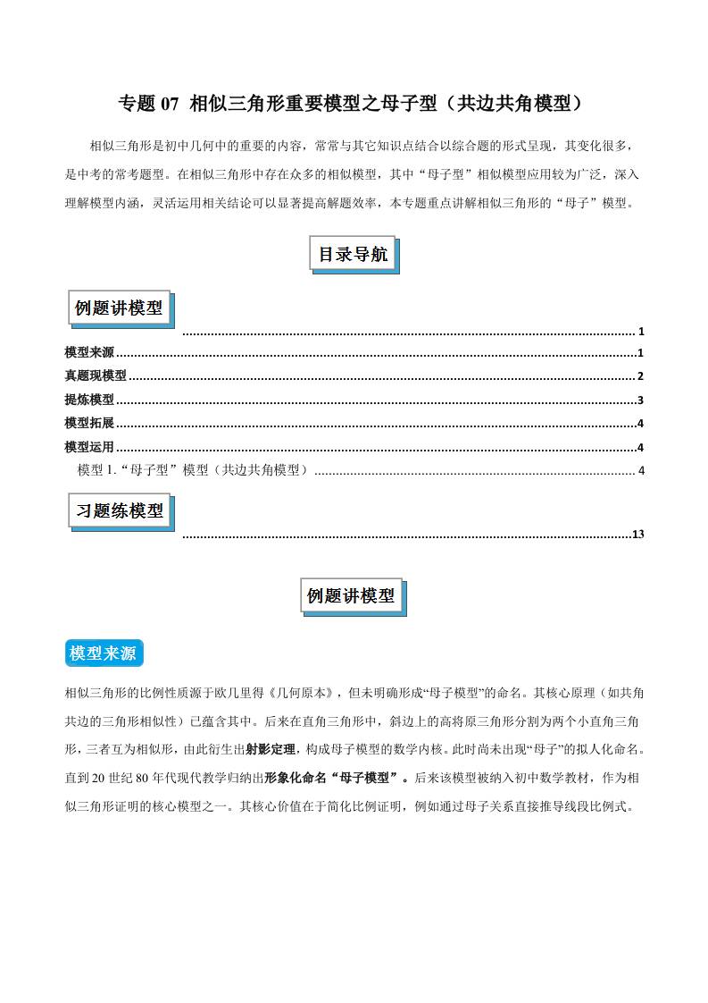 专题07 相似三角形重要模型之母子型(共边共角模型)(几何模型讲义)(学生版)