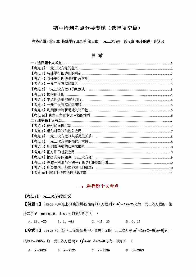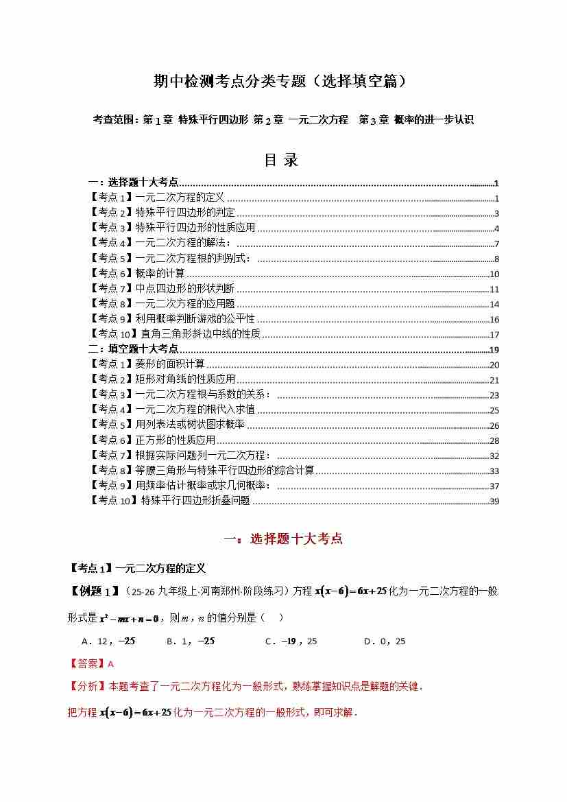 期中检测考点分类专题(选择填空20大考点分类精析)(北师大版 )(学生版)