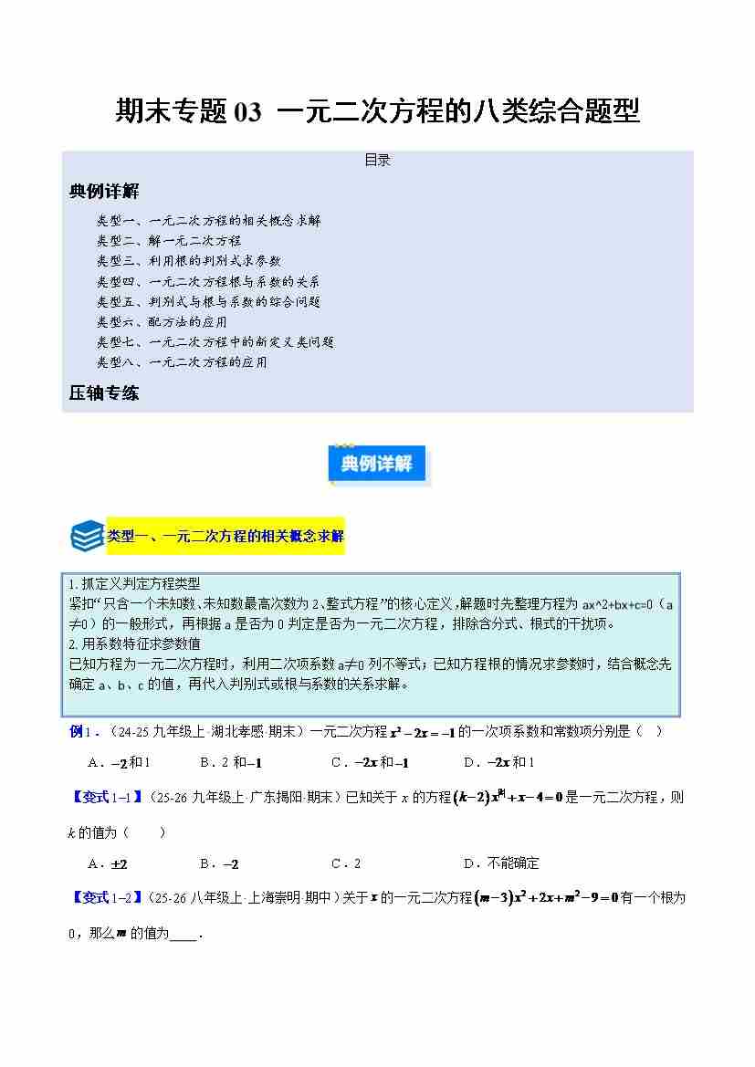 期末专题03 一元二次方程的八类综合题型(压轴题专项训练)(原卷版)